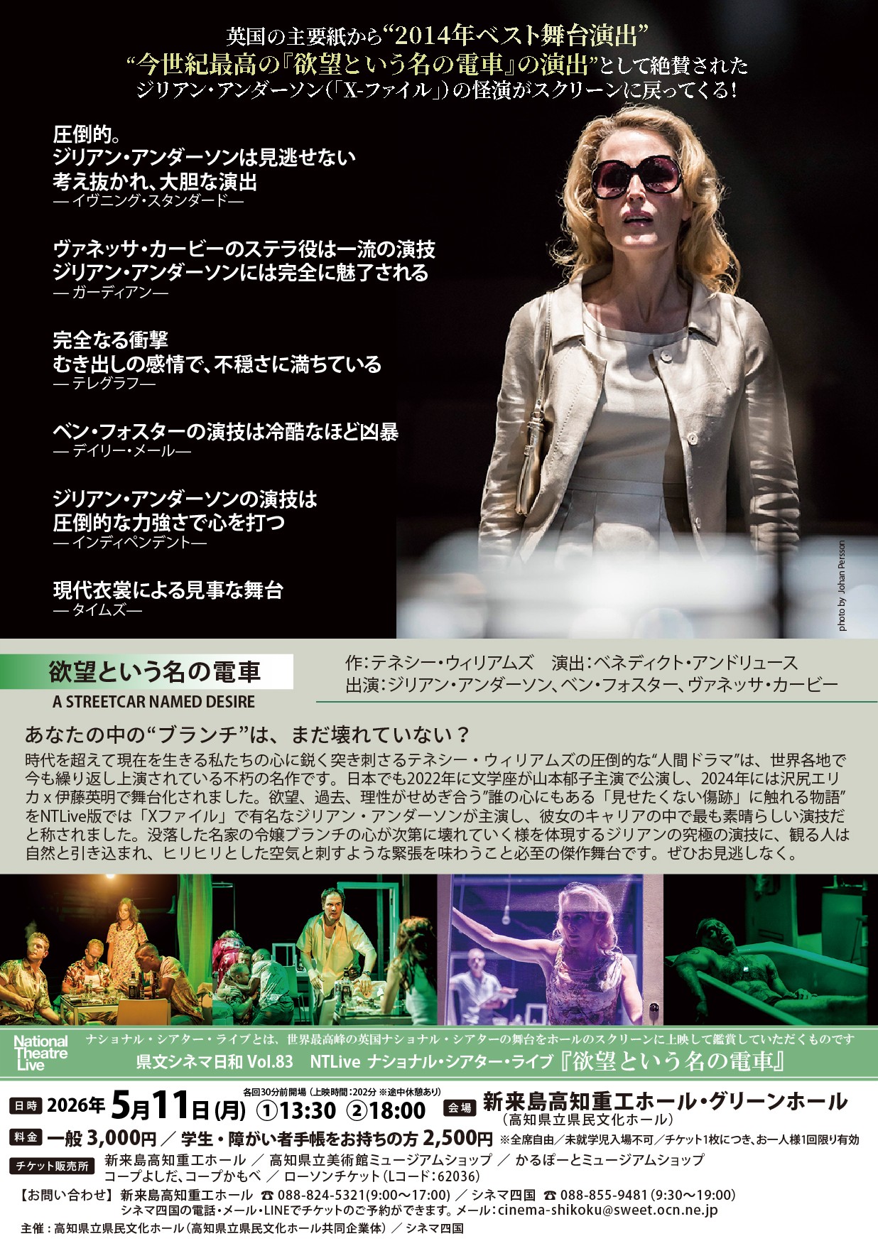 世界最高峰の英国ナショナル・シアターが選りすぐった舞台作品を映像化し、大スクリーンで上映する人気企画「ナショナル・シアター・ライブ」を開催。 映画でも語り継がれるテネシー・ウィリアムズの名作『欲望という名の電車』が、NTLiveで高知へ。没落令嬢ブランチの脆さと強がり、スタンリーの暴力性、愛と依存がむき出しで衝突する――濃密な3時間22分。「X-ファイル」で知られるジリアン・アンダーソンが“キャリア最高”と称される熱演でブランチを体現し、英国主要紙が絶賛した舞台を大スクリーンで体感してください。 (上映時間:202分※途中休憩あり) VIDEO